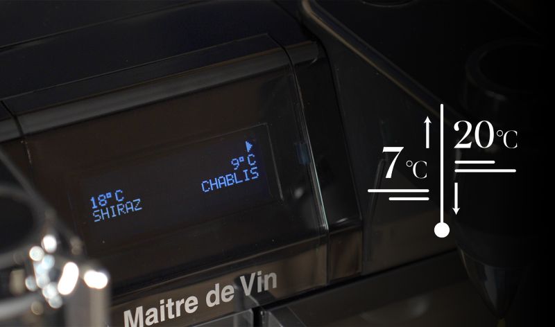 Maitre de Vin® 多功能餐酒机,为您打造极致的品酒体验。专业恒温,将存酒温度控制于7°C到 20°C 之间,让你选择你喜欢的饮用温度。配备即时醒酒功能,确保每一杯酒展现最佳风味。